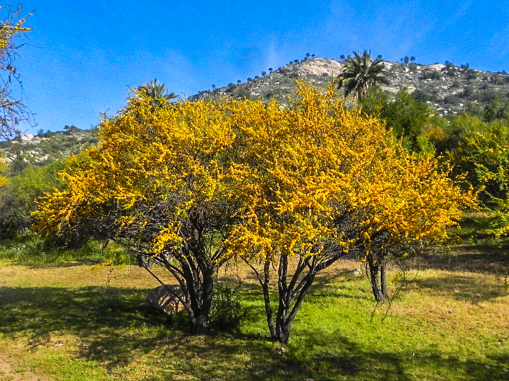 INFLORESCENCIA Y FLORES: Amarillas y perfumadas muy pequeñas, dispuestas en inflorescencias esféricas compactas (“pompones”) con un tallito o pedúnculo corto, de entre 4 y 18 mm de largo. Los “pompones” se agrupan de a 2 a 7 y a veces parecen pegados a las ramas.